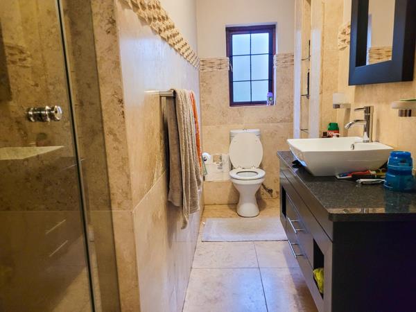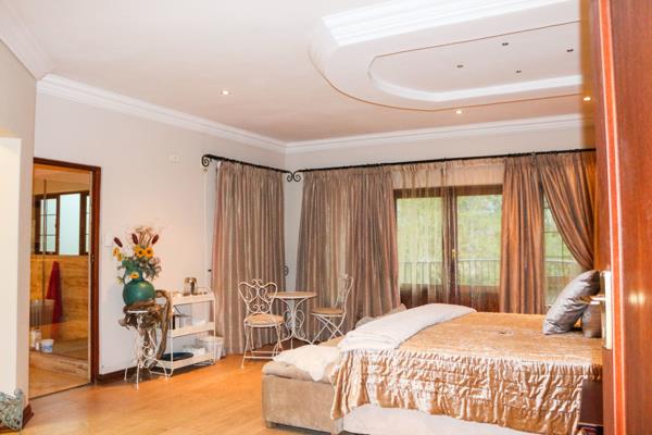 This home boasts all the bells and whistles. With a grand entrance, opening to an open plan living area which includes 2 sitting areas and a dining area. The dining area open to a gorgeous, landscaped garden where the family can relax and that a breather on cool summer night. The large, enclosed patio area has a built-in braai as well as a gas braai, with stacking doors that brings the outdoors inside. The crystal-clear pool lies between the patio and open green belt walk-way. The garden has a full garden irrigation system.