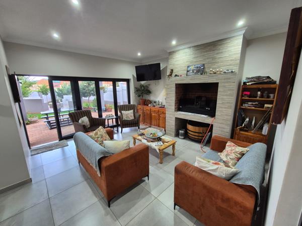 The enclosed entertainment area, complete with a built-in braai, flows seamlessly onto a patio overlooking a beautifully landscaped garden with a bomaperfect for outdoor gatherings.