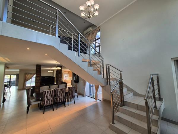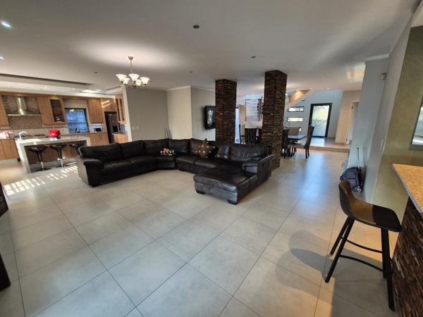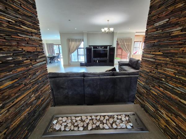 Enjoy seamless flow in the open-plan living areas, which include a designer kitchen with upmarket finishes, a centre island, breakfast nook, pantry, and scullery/laundry. The dining room and lounge are separated by a sleek contemporary white pebble fireplace, creating a warm, elegant ambiance. An indoor entertainment area with a built-in bar and braai opens to a covered patio, overlooking a lush landscaped garden and sparkling poolideal for entertaining or relaxing with family.
