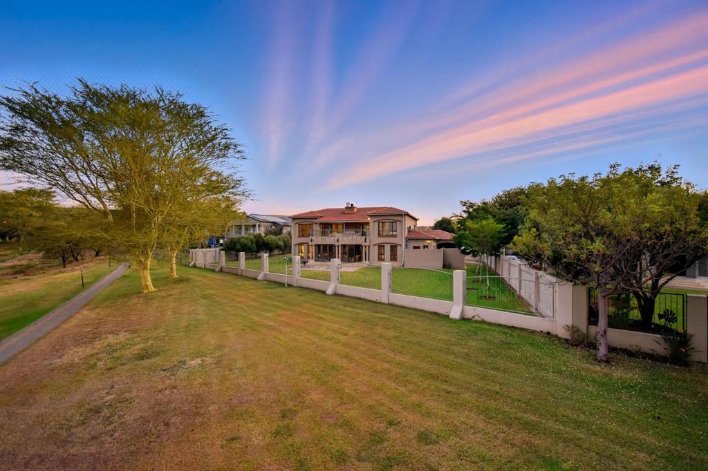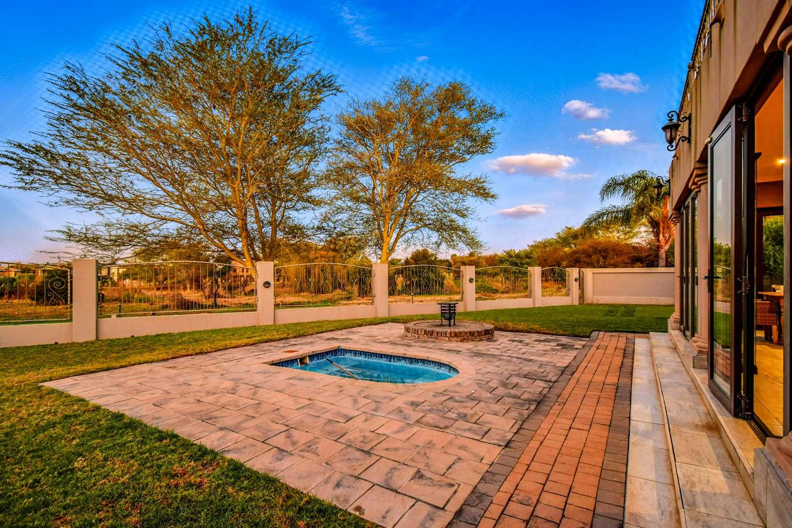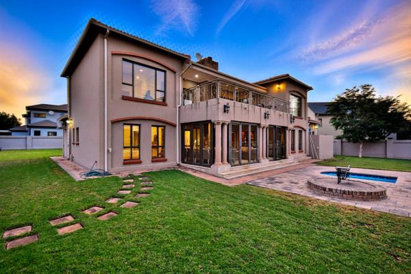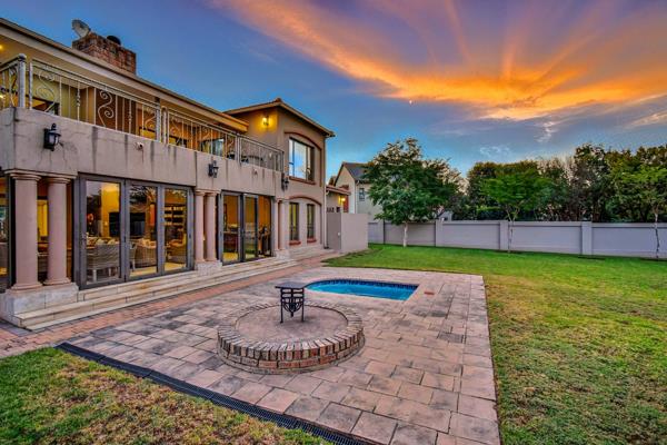 a secure safe room complement a lavish en-suite bathroom with dual basins, separate bath and shower, and a private WC. Additional bedrooms boast built-in cupboards, polished floors, and direct access to undercover outdoor patioswith one enjoying its own en-suite and walk-in closet. Outside, a sprawling wrap-around garden with a splash pool and a cozy boma-style fireplace overlooks the estates green belt, and a separate domestic quarter with its own en-suite completes this exceptional family home designed for comfort, elegance, and unforgettable gatherings.