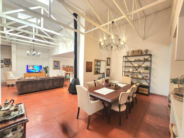 The open-plan kitchen is a chefs dream, featuring granite countertops, a breakfast nook, a center island with a gas hob, and a scullery/laundry for added convenience. The spacious dining and lounge area leads to an indoor entertainment space equipped with a fireplace, built-in bar, and built-in braai, perfect for hosting guests year-round. A large study with a private entrance makes for an ideal home office.