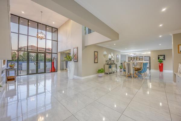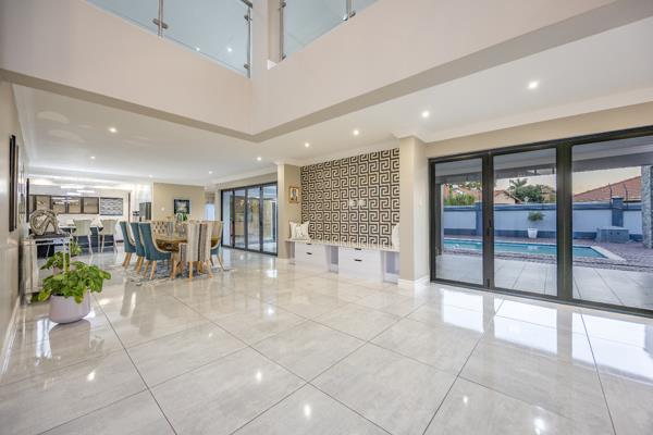This expansive double-storey home offers an exceptional blend of elegance, comfort, and functionality, perfectly designed for both family living and entertaining. Downstairs, a grand entrance hall welcomes you into the spacious living and dining areas, complete with built-in cupboards and seamless flow to the patio and built-in braai area. The open-plan kitchen features a separate scullery, pantry, and convenient bar area, while additional spaces include a guest bedroom with a full en-suite bathroom, domestic quarters, a guest toilet, laundry room in the garage, and two double garages. Outdoors, a large swimming pool, rainwater JoJo tanks, and solar power ensure sustainable luxury.