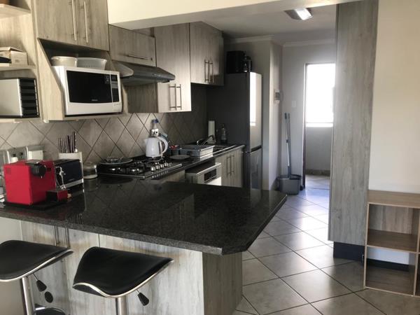 This unit consists of 2 spacious bedrooms all with built in cupboards and tiled floors. 2 Bathrooms with modern finishes. This spacious unit has an open plan living area with a kitchen that is equipped with oak wood cupboards and stunning granite tops. The kitchen has an under counter oven, gashob and extractor fan as well as sufficient built in cupboards. The unit has one covered parking.