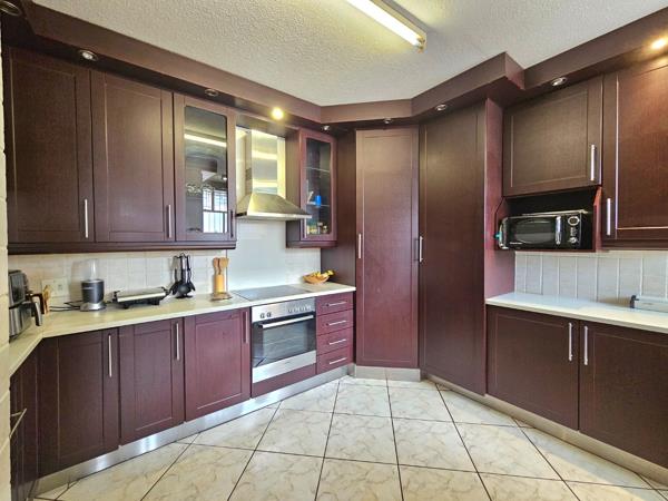 The heart of this home is its modern kitchen, boasting extensive dark wood-toned cabinetry complemented by light countertops. It comes equipped with an eye-level oven, hob, extractor fan, breakfast nook, space for a double door fridge and a built-in microwave, ensuring both functionality and a sleek aesthetic. Ample storage solutions, including glass-front cabinets, cater to all your culinary needs. The adjacent scullery also thoughtfully incorporates space for three appliances, enhancing convenience.