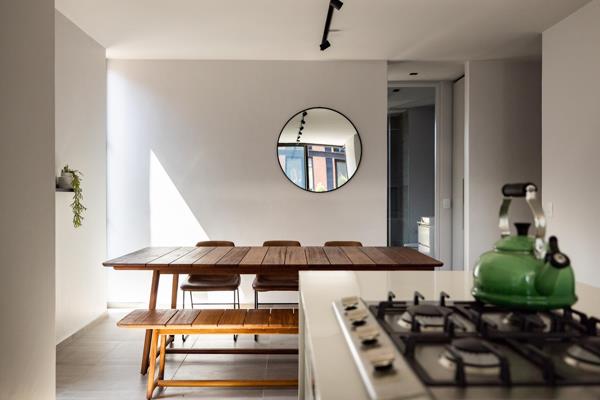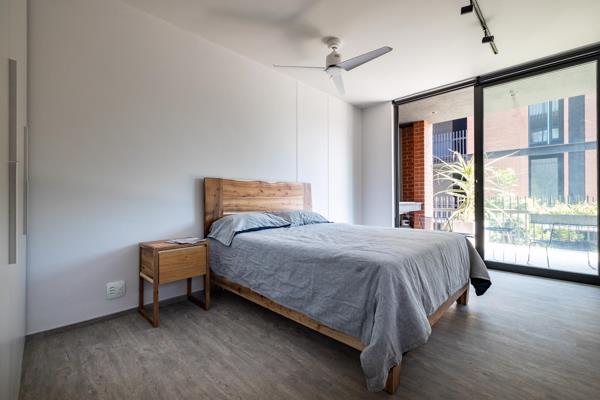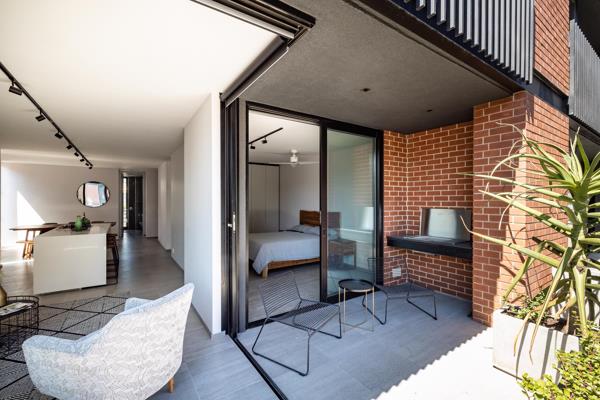 High Quality aluminium sliding doors lead out from both living area and main bedroom onto spacious, lush balcony amongst the trees with private braai area.