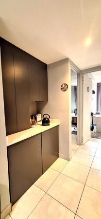 Discover an exquisite urban sanctuary within a prestigious security estate in Brooklyn, Pretoria. This sophisticated 89 sqm residence epitomizes contemporary luxury, offering a meticulously designed open-plan living experience. The heart of the home is a sleek, modern kitchen, boasting dark grey cabinetry, integrated appliances, and a chic breakfast bar island, seamlessly flowing into a refined lounge area. The industrial-chic aesthetic, with its exposed concrete ceilings and elegant tiled flooring, creates a distinctive and aspirational ambiance.