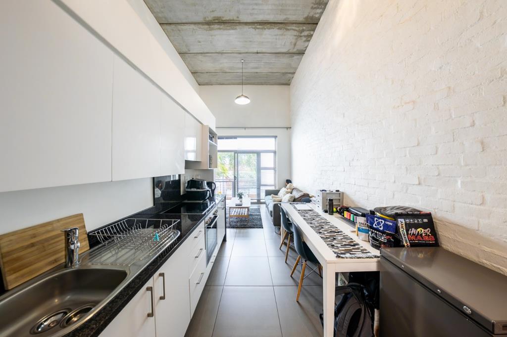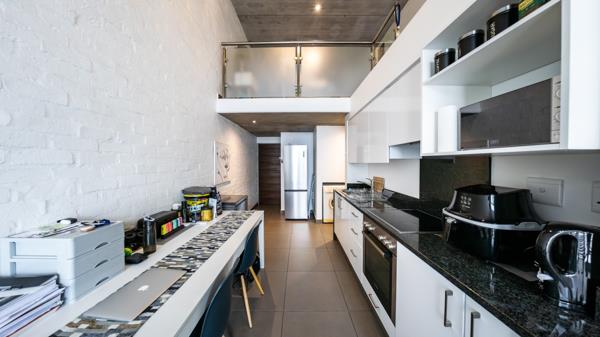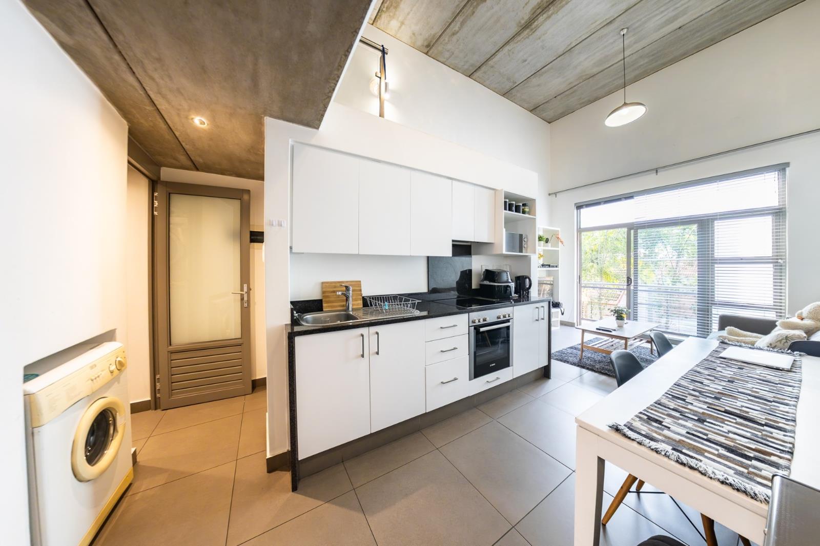 The interior boasts an inviting open-plan layout, seamlessly connecting the living spaces. The modern kitchen is well-appointed with an integrated hob and oven, complemented by ample storage, making meal preparation a delight. The bright living area features large windows and sliding doors that invite natural light and provide direct access to a private balcony, offering scenic views of the surroundings. High ceilings with an industrial-chic exposed concrete finish add a distinctive character to the space, while the apartment comes fully furnished for immediate occupancy.