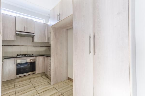 The contemporary kitchen is equipped with light wood-grain cabinetry, dark countertops, an integrated oven, gas hob, and extractor fan, offering ample storage. Three comfortable bedrooms, including an en-suite, are finished with modern tiled flooring. Outside, a versatile covered patio with roll-down screens leads to an enclosed entertainment space featuring a built-in braai, perfect for year-round enjoyment. A private garden and two dedicated parking bays complete the outdoor amenities. Embrace sustainable living with installed solar panels, inverter, and 5KW battery backup system, significantly reducing electricity costs. Fibre-ready connectivity is available. Enjoy scenic views and river frontage within the estate, with the added convenience of a dam, victoria park, fishing, a coffee shop, a communal pool area, communal braais, and a communal entertainment area, enhancing the lifestyle offerings of this exceptional home.