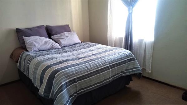 The kitchen offers ample cupboard space and the open plan living room offers more than enough space for a lounge suite and a small dining table.