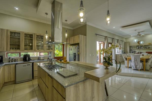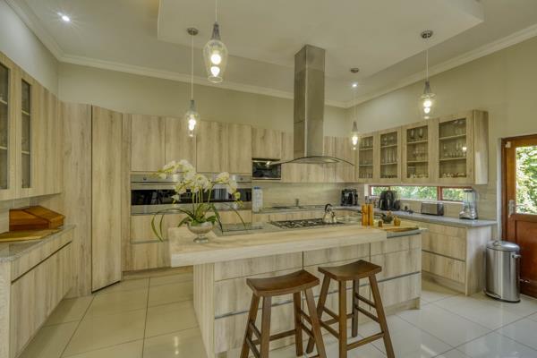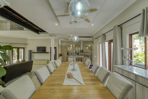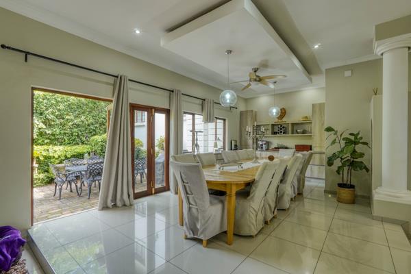The outdoors are just as impressive, with manicured gardens surrounding a sparkling pool and four verandas that provide multiple settings for relaxation and entertainment. A communal braai area offers a welcoming atmosphere, while mature greenery ensures privacy and a sense of retreat.