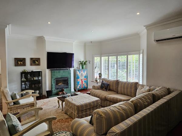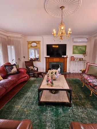 From a stately entrance hall leads the more formal section from this spacious family home of approximately 485m, flowing to the left into the formal lounge with a cosy fireplace and huge aluminium stack doors opening to the multi-functional open-air veranda with a huge section also under roof, as well as the boma and barbecue area. Down the hallway is the study, the dining room that also opens up with stack doors to the outside veranda, and the enormous family room with its own fireplace all fitted with air-conditioning units and all with immaculate, gleaming wooden small tiled, Parquet Floors. The natural light and spacious modernized kitchen, has Caesarstone tops and is fitted with both gas- as well as electric appliances. There is a separate scullery and also an outside door that practically opens up to the outside entertainment area and veranda. A staircase goes down into the over-sized and huge open space garage that with minimum alterations, could fit 4 or 5 cars or use as is with double doors for two cars plus the huge, open floorspace for a workshop and a walk-in cold storage room which would make a hunter, extremely happy!