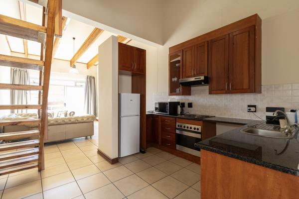 A set of elegant wooden stairs leads to the generously sized carpeted loft bedroom, complete with built-in cupboards. The modern bathroom, located downstairs, is fitted with a shower, toilet, and basin for easy access from the living area.