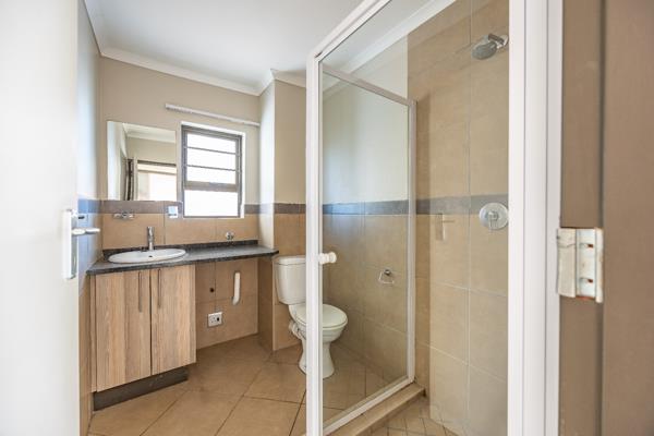 The unit includes two well-sized bedrooms with built-in cupboards. The main bedroom offers the convenience of an en-suite bathroom with a bath, while the second bathroom features a shower and space for a washing machine ideal for functional everyday living.