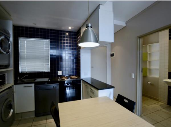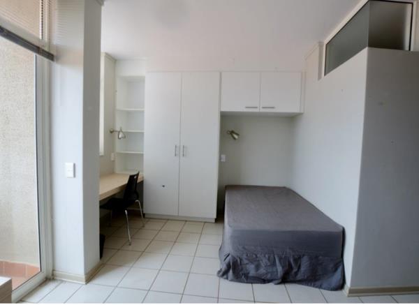The unit features a spacious bedroom equipped with a single bed, two study desks, and ample built-in cupboards for convenient storage. The modern, open-plan kitchen is both functional and stylish, designed to accommodate all necessary appliances, including a dishwasher, washing machine, tumble dryer, and fridge. A kitchen table with chairs complements the space, which flows effortlessly into a welcoming living area. This living space opens to a private balcony through glass doors, offering serene views perfect for relaxation.