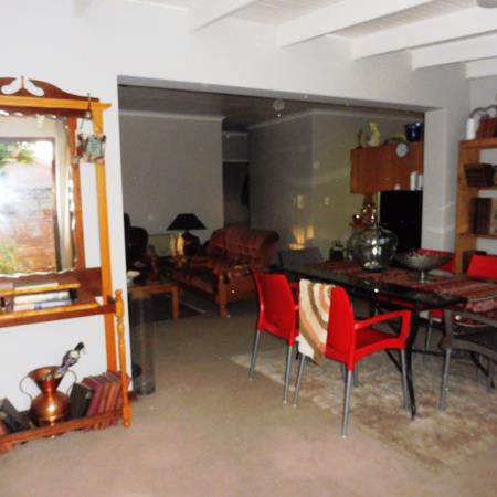 The kitchen is compact and functional with an electric free-standing stove and oven, space for a fridge, dishwasher or washing machine and microwave. There is a double sink, built-in display cabinets and packing space. The kitchen door leads to the back courtyard as well as a private paved area, with a large flowering pink hibiscus, ideal for turning into a braai area .