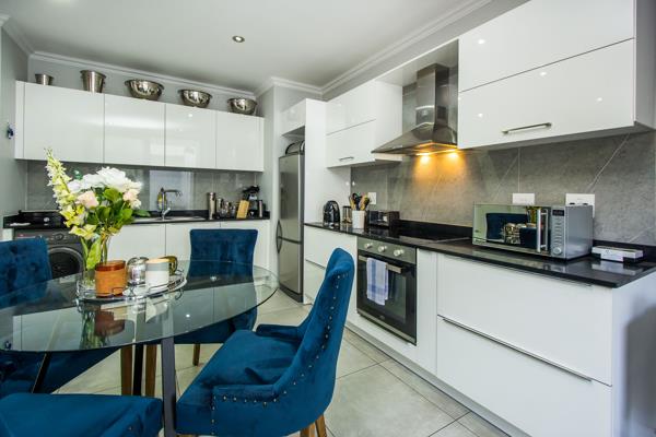 The kitchen is well equipped with ample cupboard space, high-quality finishes, and has space for a fridge and two appliances.