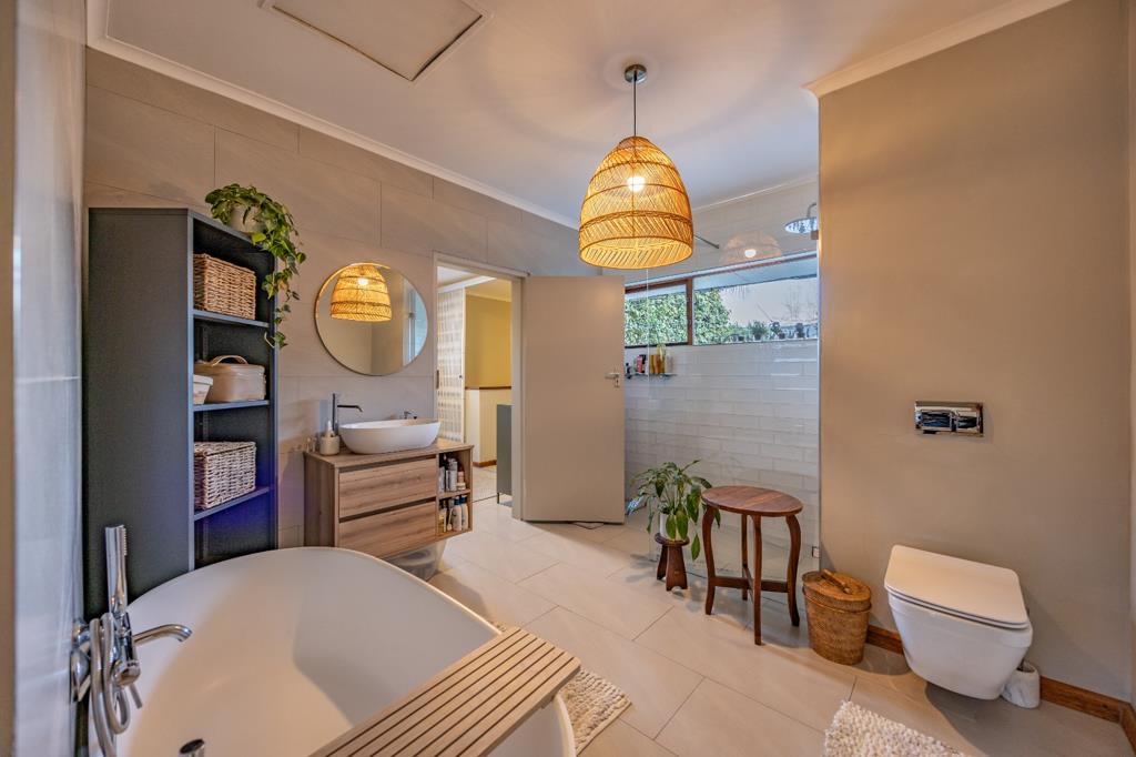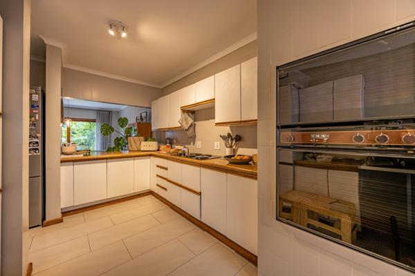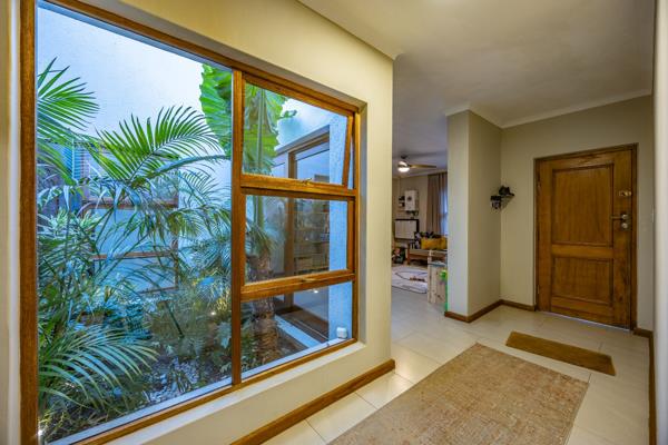 The home welcomes you with an open-plan kitchen, dining, and living area wrapped around a lush indoor atrium that forms the heart of the home. A built-in closed-combustion fireplace adds a cozy touch, while sliding doors open onto a tranquil garden with a shaded patio and built-in braaiperfect for effortless outdoor entertaining. The ground floor also features a spacious main bedroom with a full en-suite bathroom and direct garden access. Upstairs, two generously sized bedrooms with soft new carpeting offer peaceful retreats, one with a full en-suite bathroom and tree-lined views, cleverly designed to also serve the second bedroom if needed.