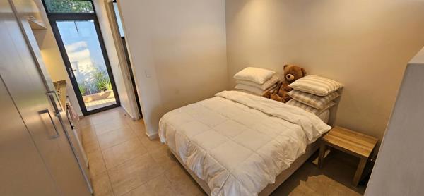 This refined residence offers a spacious bedroom with high-quality built-in cabinetry and a modern, well-appointed bathroom.