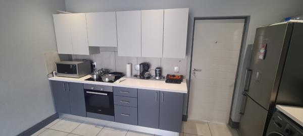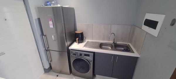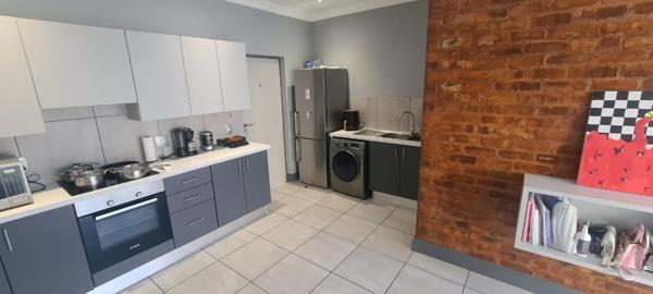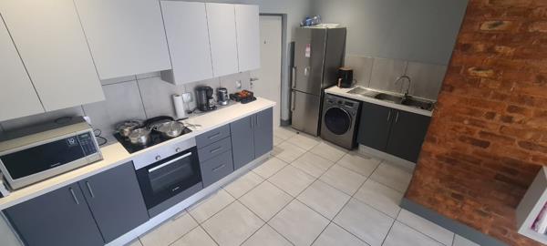 The modern and beautifully finished kitchen with plenty of built-in cupboards, is complemented by a fridge, microwave, and a convenient wash/dryer combo, enhancing the overall convenience and efficiency of your living space.