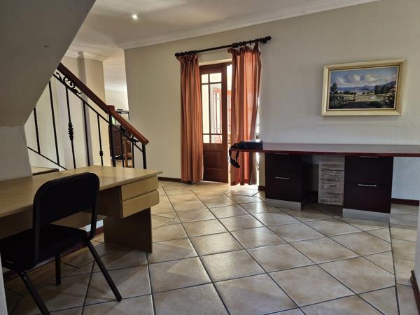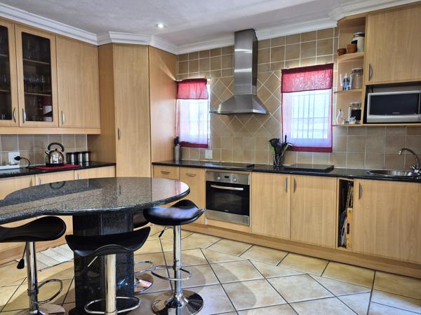The functional and beautiful kitchen is spacious and well-equipped with ample cupboards, sleek granite countertops, an electric glass-top stove, a chimney hood extractor, a prep basin, and a centre island. There is plenty of working space and room for a fridge and smaller appliances. The separate scullery area is conveniently close to the back door and washing line, adding to the home''s practicality.