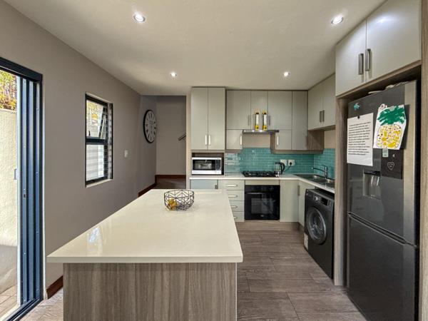 Downstairs, the open-plan kitchen flows into spacious living and dining areas, with stacking doors opening to your private garden and braai area, perfect for entertaining. The kitchen includes a gas hob, centre island which is great for meal prepping, space for one appliance and an additional water point in the garage for extra appliances.