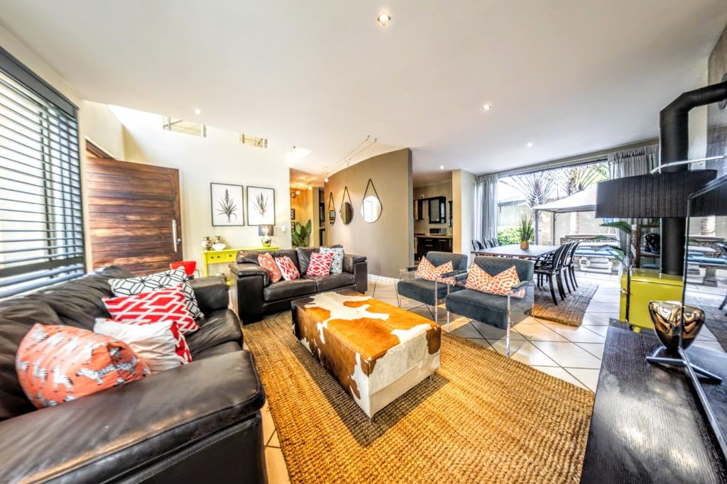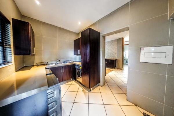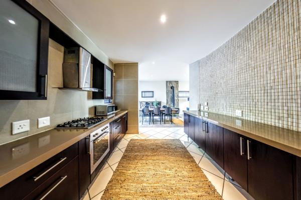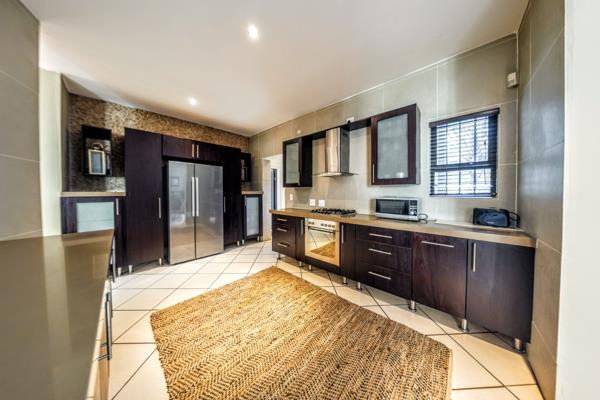 Outdoors, a well-maintained garden offers relaxation and entertainment with a seating area beside the built-in braai and a six-seater hot tub for year-round enjoyment. The motorized double garage and double carport ensure secure parking for family and guests.