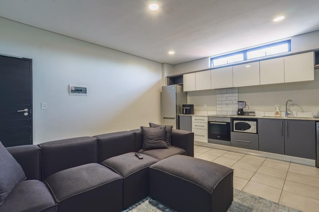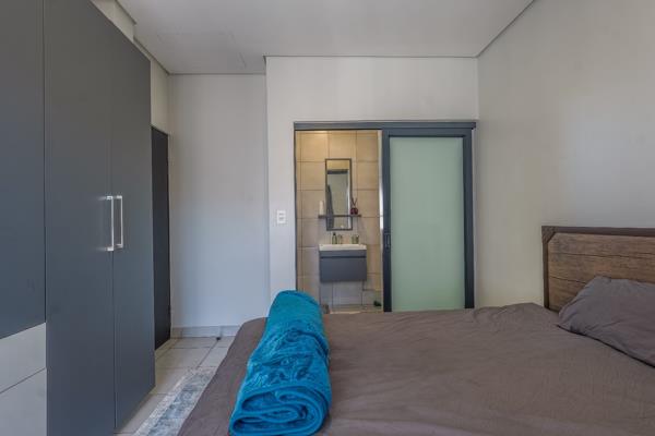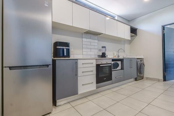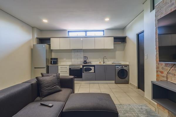 This modern 1-bedroom, 1-bathroom apartment offers sophisticated and convenient living in Menlo Park, Pretoria. The open-plan living area is designed for contemporary comfort, featuring a stylish exposed brick accent wall with space for a wall-mounted TV and a comfortable sectional sofa. The integrated kitchen boasts modern two-tone cabinetry, a subway tile backsplash, and essential appliances including a fridge, stove, oven, microwave, and washing and dryer machine. Tiled flooring throughout ensures a clean, low-maintenance environment. The well-appointed bedroom provides a private sanctuary with space for a study table. Natural light fills the room. The en-suite bathroom, accessible via a modern frosted sliding door, showcases sleek grey tiling, a floating vanity, and a contemporary glass-enclosed shower. Built-in wardrobes offer practical storage, contributing to the apartment''s efficient design.