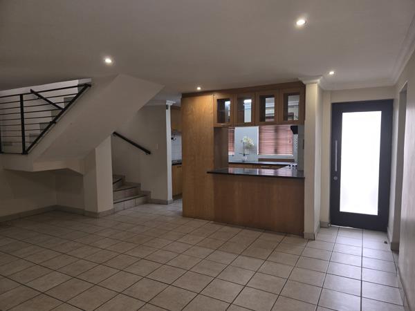 You will love living in this homely townhouse, offering open-plan living and a stylish kitchen with space for a dishwasher. Enjoy a lock-up garage with direct access, a private walled garden with a patio and built-in braai, a spacious laundry, and solar power for added convenience. The main bedroom upstairs has ample cupboards ,an en-suite bathroom and a private balcony. the second bathroom has a shower and bath,