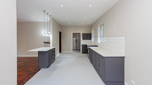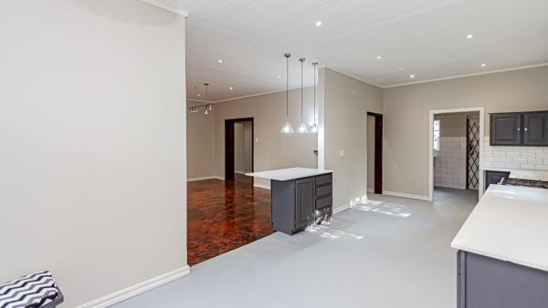 The kitchen is a culinary masterpiece, featuring sleek Caesarstone countertops, a gas stove and hob, ample cupboard space, and a seamless connection to both the pantry and scullery. Beautiful screed flooring and a charming bay window conversation nook overlook the patio and garden, adding warmth and personality to the space.