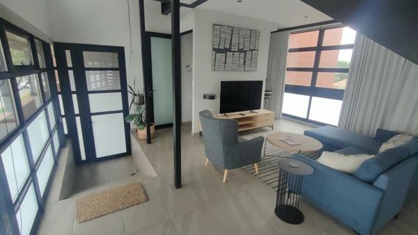 Downstairs: Expansive open-plan living area with lounge, study (convertible to guest room), and guest bathroom.