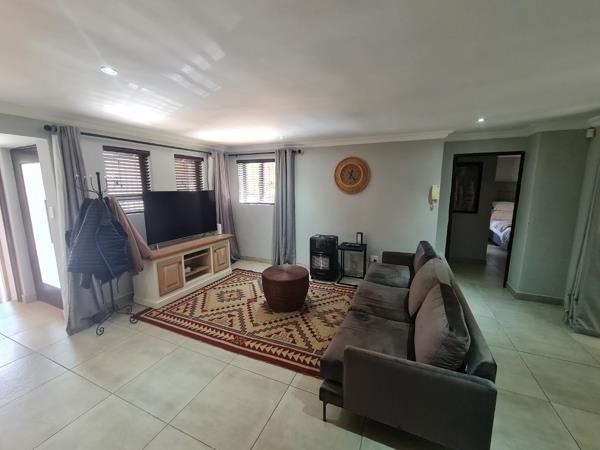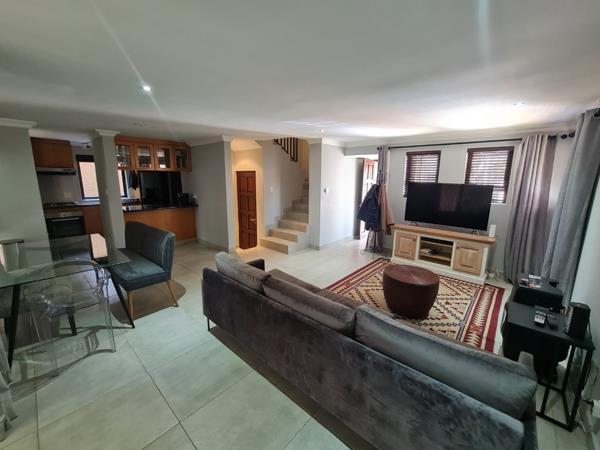 Outside, a charming garden and patio area awaits, complete with a built-in braai for entertaining. The property includes two garages and an additional parking space, with pets allowed. Comprehensive security features, including an access gate, alarm system, electric fencing, CCTV surveillance, and security bars on sliding doors, provide a secure environment within the complex, offering peace of mind.