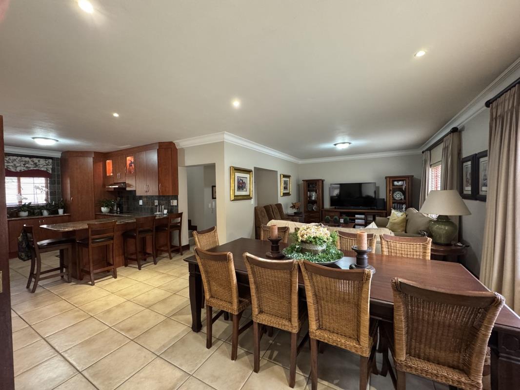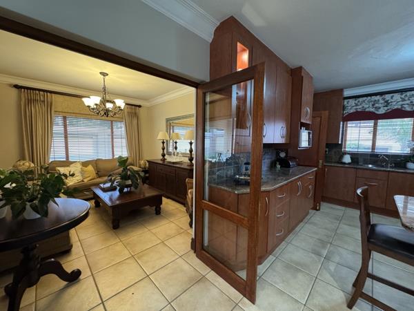 The dining room that puts graciousness back into entertainment has a wooden frame glass door leading to a covered sunny patio with built-in-braai, designed for lavish entertainment.