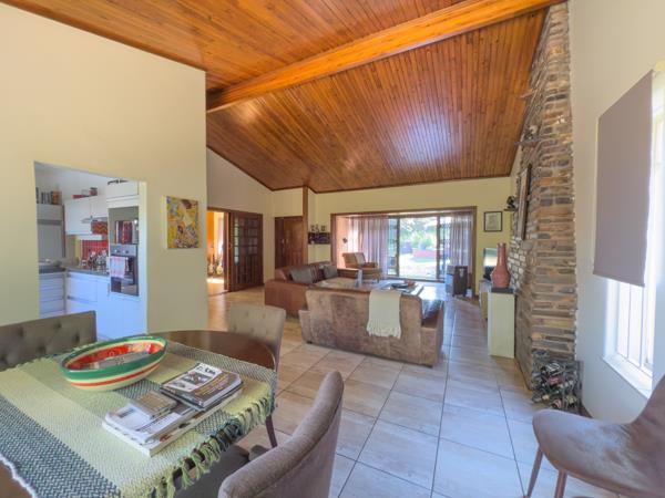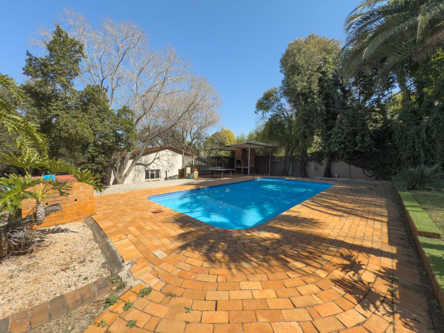 At the heart of the property lies a lush garden with a sparkling swimming pool and lapa/braai area, the perfect setting for relaxation and entertainment. The garden is supported by a borehole with manual irrigation, ensuring year-round greenery.