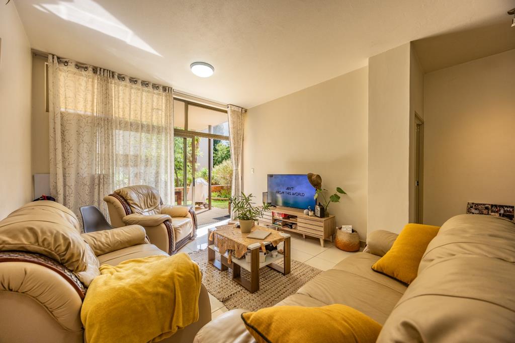 Glass sliding doors lead from the lounge onto a covered patio, perfect for outdoor dining or relaxing, with direct access to a small private grass garden a rare feature offering extra outdoor space and a tranquil setting. Both bedrooms are bright and spacious with built-in cupboards and curtain rails, while the centrally located bathroom (shower, basin, bath and toilet) is ideal for shared or guest use. The absence of an en-suite allows for a more open and simplified layout, perfect for young professionals, small families, or investors.