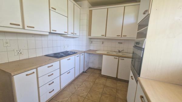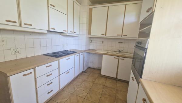 The kitchen is bright and sunny, providing space for three appliances and a double door fridge.