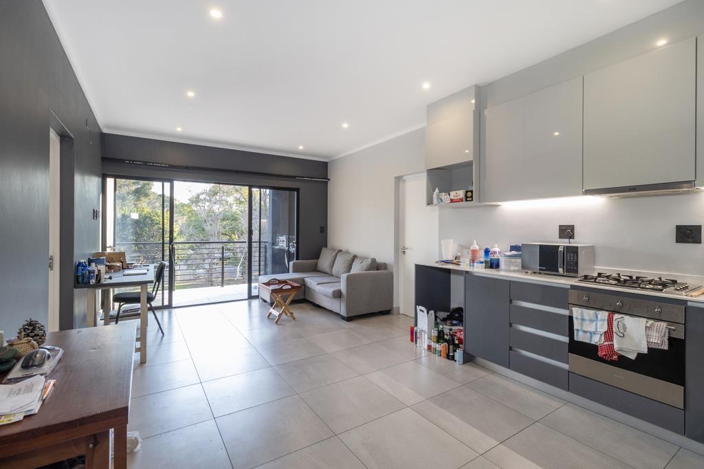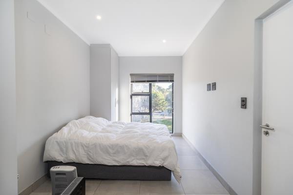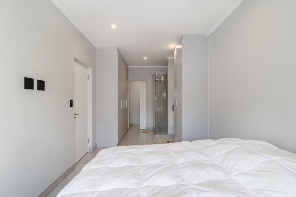 Designed for both comfort and style, the apartment welcomes you with an abundance of natural light, creating a sense of openness and serenity throughout. The open-plan layout has been thoughtfully curated to enhance flow and functionality, with a gourmet kitchen at its center. Outfitted with granite countertops, a Smeg gas stove ideal for cooking during loadshedding, high-end appliances, and generous cabinetry, the kitchen is both practical and luxurious. The living and dining areas extend effortlessly to a private balcony, offering a tranquil space to unwind or entertain under the evening sky.