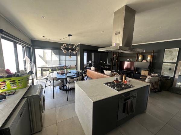 The open-plan living area features sleek finishes, large tiles and plenty of natural light. A designer kitchen with a gas hob, electric oven, hidden pantry and quality cabinetry flows seamlessly into the lounge and dining area. Sliding doors lead to a private patio and garden, ideal for entertaining or relaxing outdoors.