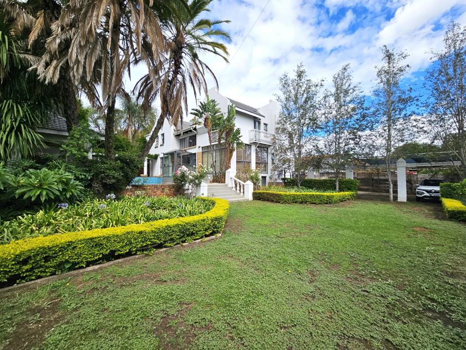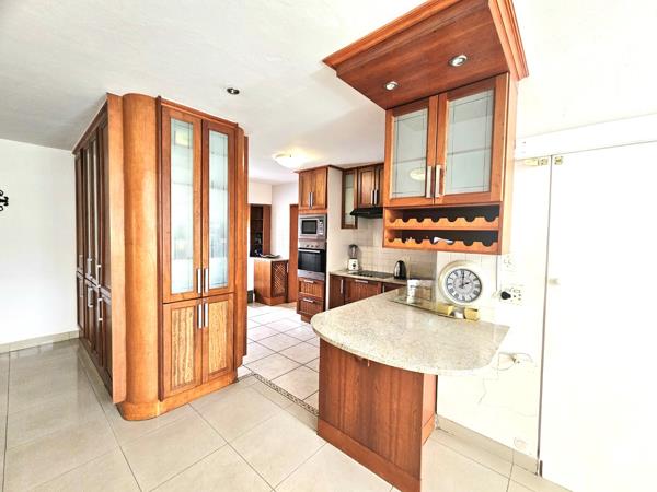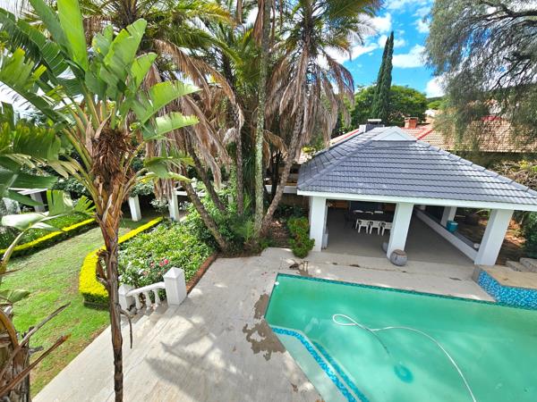 A spacious entertainment area with a built-in braai, perfect for hosting unforgettable gatherings by the a sparkling swimming pool and the picturesque, well-manicured garden, with lush greenery offering tranquility.