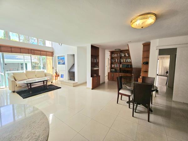 A spacious and inviting living and dining area, complete with a fireplace and a built-in library bookshelfperfect for cozy reading nooks or showcasing treasured collections. This room leads into a glass enclosed jacuzzi room.