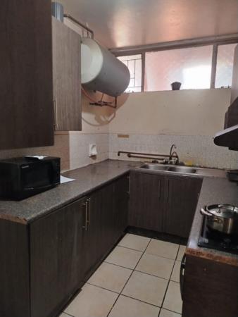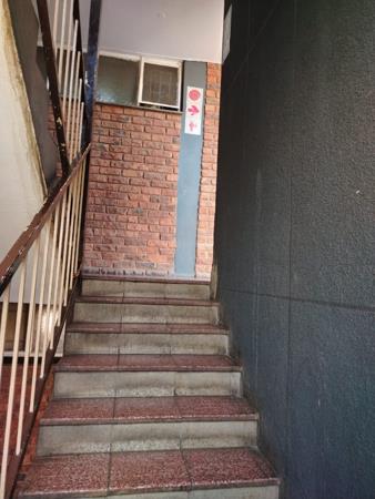 Internally, the apartment comprises five well-proportioned bedrooms and a single bathroom, providing ample accommodation within its efficient footprint. The kitchen, designed in an L-shape, maximises utility with dark wood-look cabinetry, speckled countertops, and a double stainless steel sink. Natural light permeates the space via a high-level frosted window, while a wall-mounted water heater and a portable cooktop cater to daily requirements. Common areas, including corridors and stairwells, feature durable tiled flooring and exposed brickwork, reflecting the building''s solid construction.