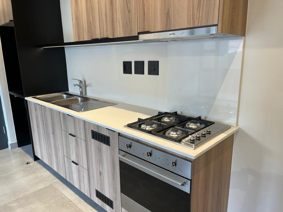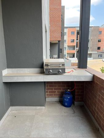A modern kitchen fitted with a gas Smeg oven, and an open-plan living area that flows seamlessly onto a private balcony complete with a gas braai - perfect for relaxed entertaining.