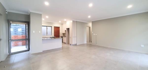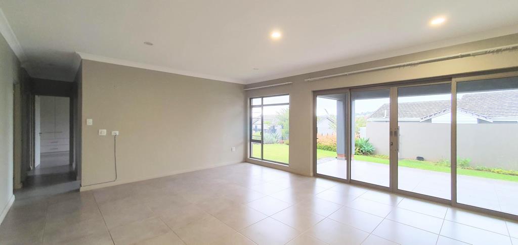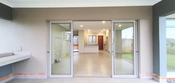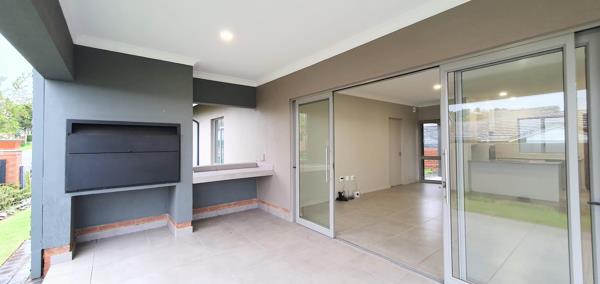 Living area opens to a spacious patio with a built-in braai, adjacent to the garden