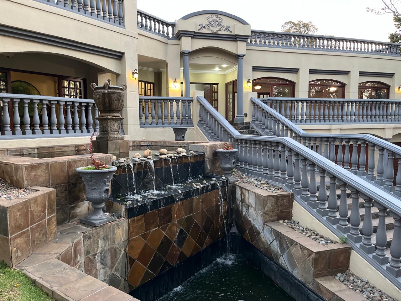 Pizza oven, storage room, Koi dam, fountain, automated-irrigation, borehole, Guard-house, large lapa with swimming pool and built in braai on the patio leading from the recreational / bar-room