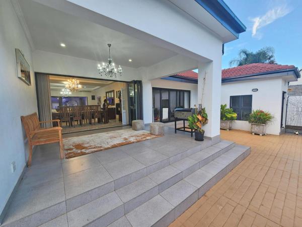 The folding stacking doors lead to two covered patios, one overlooking the sparkling pool and the other featuring an extensive built-in braai area with a pizza oven.