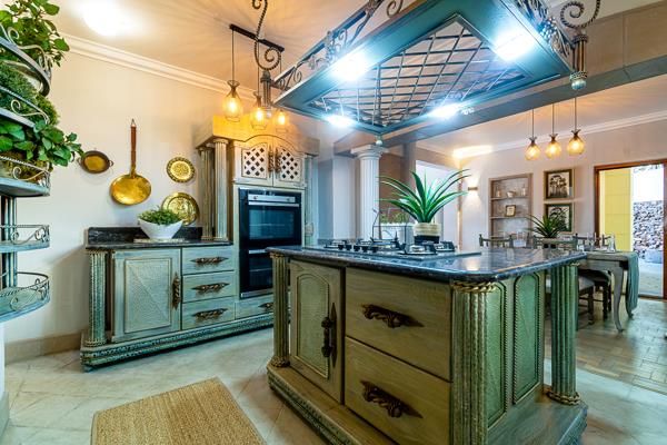 The heart of the home is the kitchen, it boasts a breakfast area all fitted with solid wood cabinetry, granite countertops, a gas hob, double eye-level ovens, a walk-in pantry, and a separate scullery and laundry.