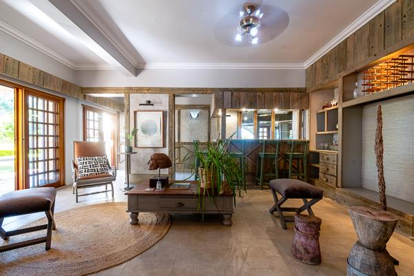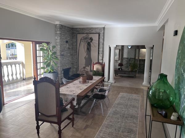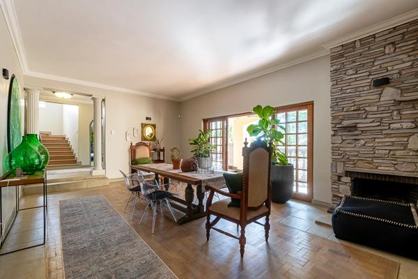Sun-drenched open-plan living and dining areas create a warm, inviting atmosphereideal for family gatherings or formal entertaining. Enjoy a dedicated entertainment area with air-conditioning, fitted bar and family room, a closed off veranda, and seamless flow to a large patio featuring a built-in braai, sparkling swimming pool, and expansive lapa.
