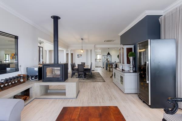The stunning open plan living area comprises a formal lounge with its eye-catching closed coupled fireplace, and stylish living and dining areas.
