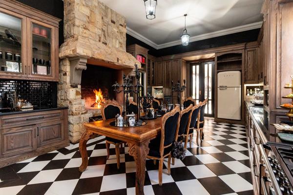 The stunning sprawling bespoke kitchen (with space for a splendid breakfast table) includes a double gas stove/oven combination, integrated fridges and a spectacular fireplace.