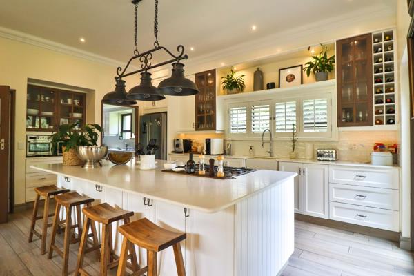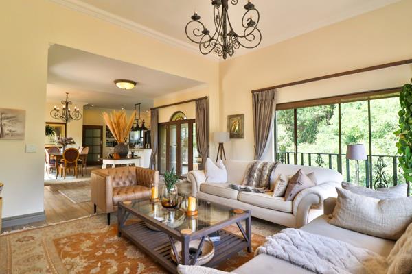 * The entrance hall has double volume ceilings and dining area flowing onto a balcony with built-in-braai overlooking the garden, stream and dam