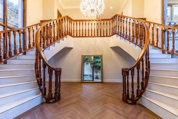 Designed for luxury and comfort, the home showcases a state-of-the-art kitchen with brand-new Smeg appliances, a built-in fridge/freezer, and a scullery. Elegant double staircases lead to sophisticated living areas, all seamlessly connecting to the expansive terraces and landscaped gardens. The entertainment level includes a bar, wine cellar, and poolside access, while the main suite offers a private balcony, multiple closets, and a lounge area. The grounds feature a spectacular swimming pool, winding driveway, and manicured terraces, creating a truly serene and private retreat.